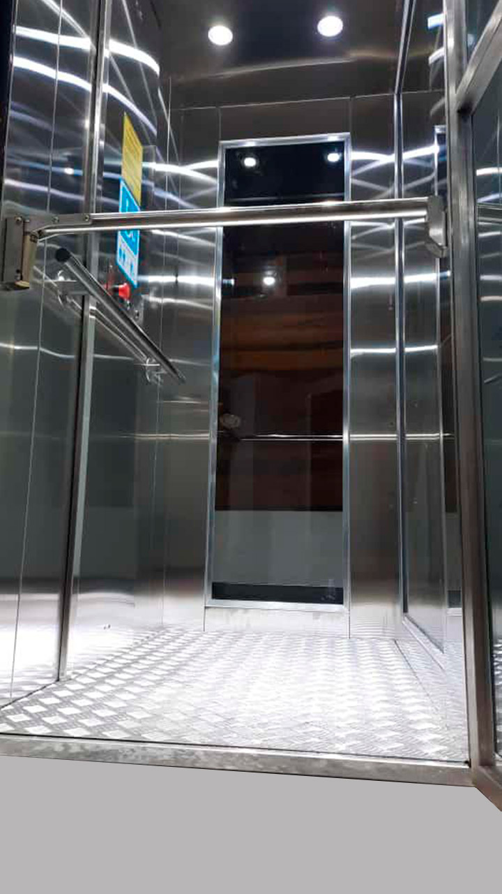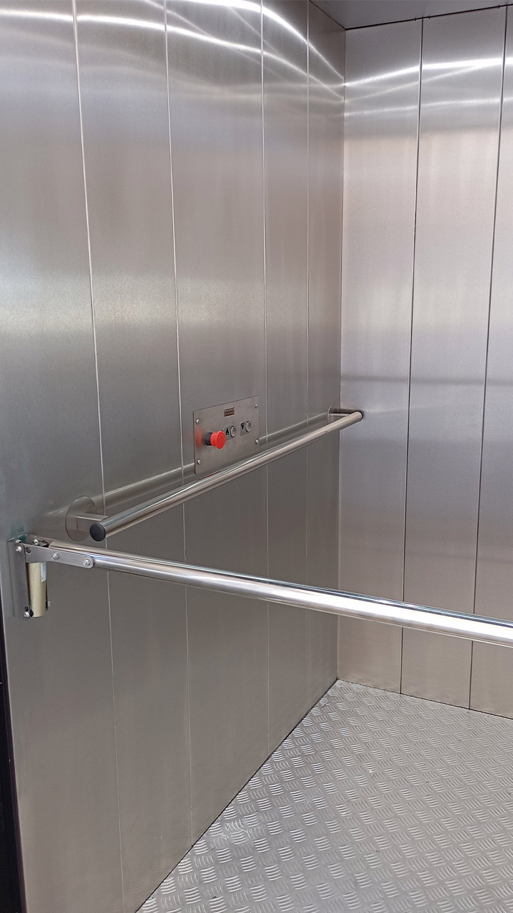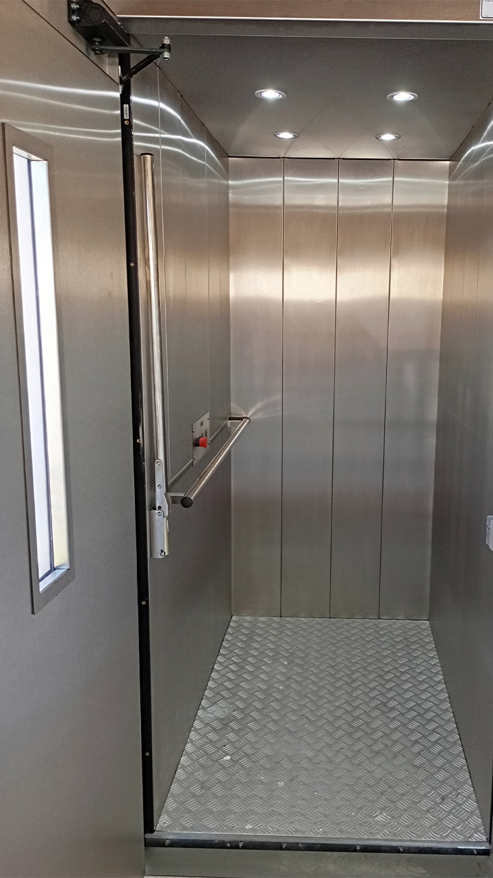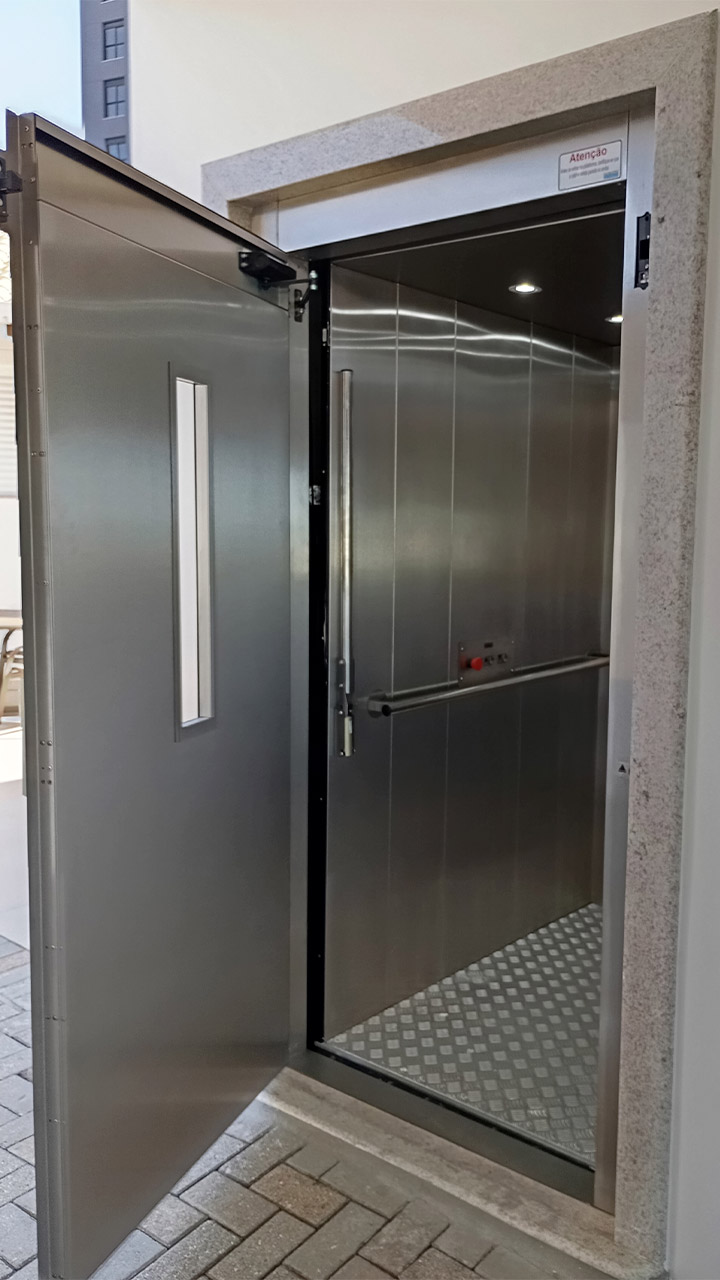 - Possui sistema de resgate, onde no caso de falha de energia elétrica o usuário aperta o botão e a plataforma desce.